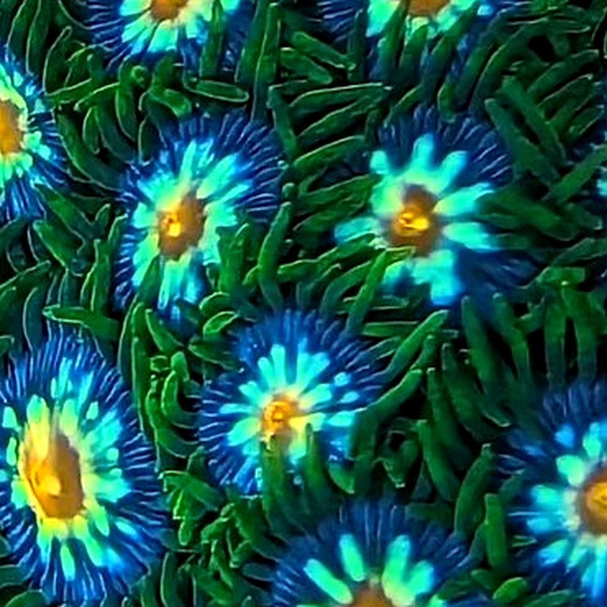 The JF Stargazer is exactly what a collector zoa should look like — deep forest green skirts framing rays that shift from electric teal to vivid blue, all radiating outward from a bright gold center. The name is fitting. A colony of Stargazers in full extension looks like a night sky frozen in your rockwork.